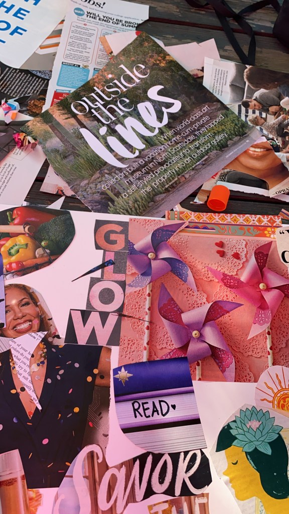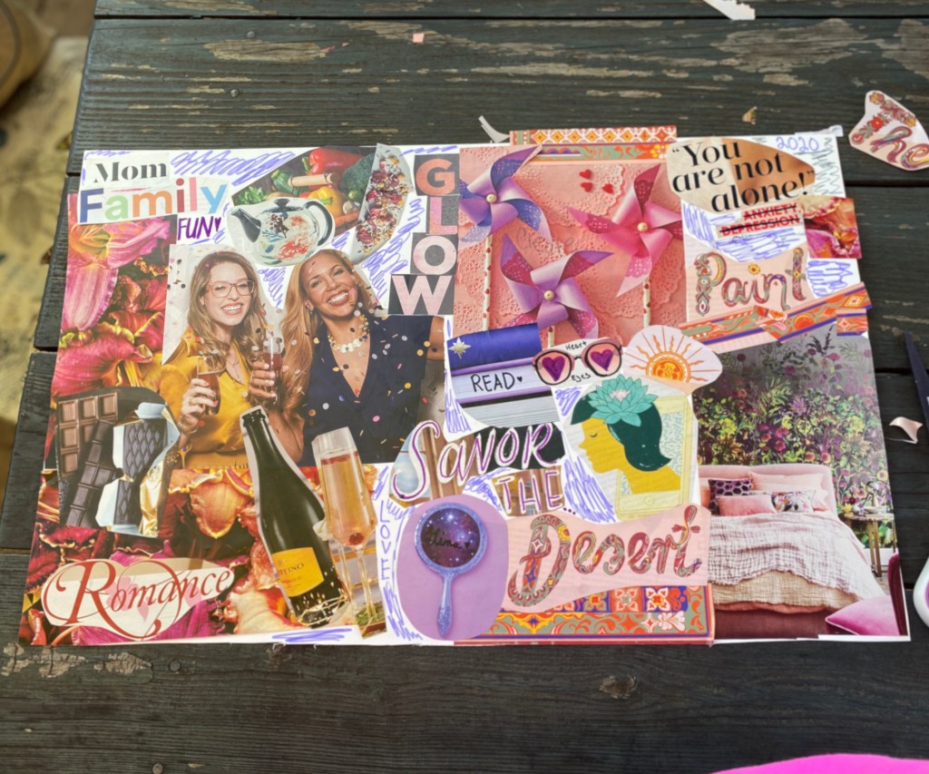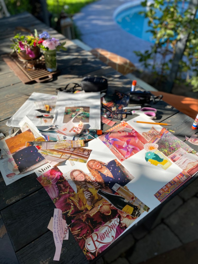 Saturday I attended a vision board party for the first time. I figured I’d go in and make an aesthetically pleasing collage of a couple ideas I had for 2020. Boy was I wrong! It was much more than that. First everyone started by picking a word they want to carry throughout the new year, mine is “create”. Then we moved on to the fun part picking out our materials. There were dozens of folders with magazine clippings in every category you could imagine, it was so fun looking through everything and piecing together my board. We all gathered in the most beautiful garden it was so relaxing and refreshing. I sat alone and did a lot of reflecting on the past year and my hopes for the new one. I already had an idea of where I was going with my vision board. I mostly wanted to make mine fun, and full of things that make me happy when I see them. Lots of champagne, friendship, date nights, art, and my shop. Last year flew by and it was really hard for me to get through the fog of PPD and PPA so I didn’t do much other than get by. As hard as the last year was it was still full of amazing moments and experiences. It sort of feels like I blinked and 2019 was over, and I know people always say time flies when you have kids and they grow up so quickly. But really…I blinked and the year was done. This year I’m creating more time for things and people I love, more art, experiences, friendships, community. All of it! 2020 is going to be truly beautiful. Squeezing in some time to create this vision board and do some reflecting was such a beautiful start to making my needs a priority. Even if it’s just one teeny thing a day, it’s so worth it.